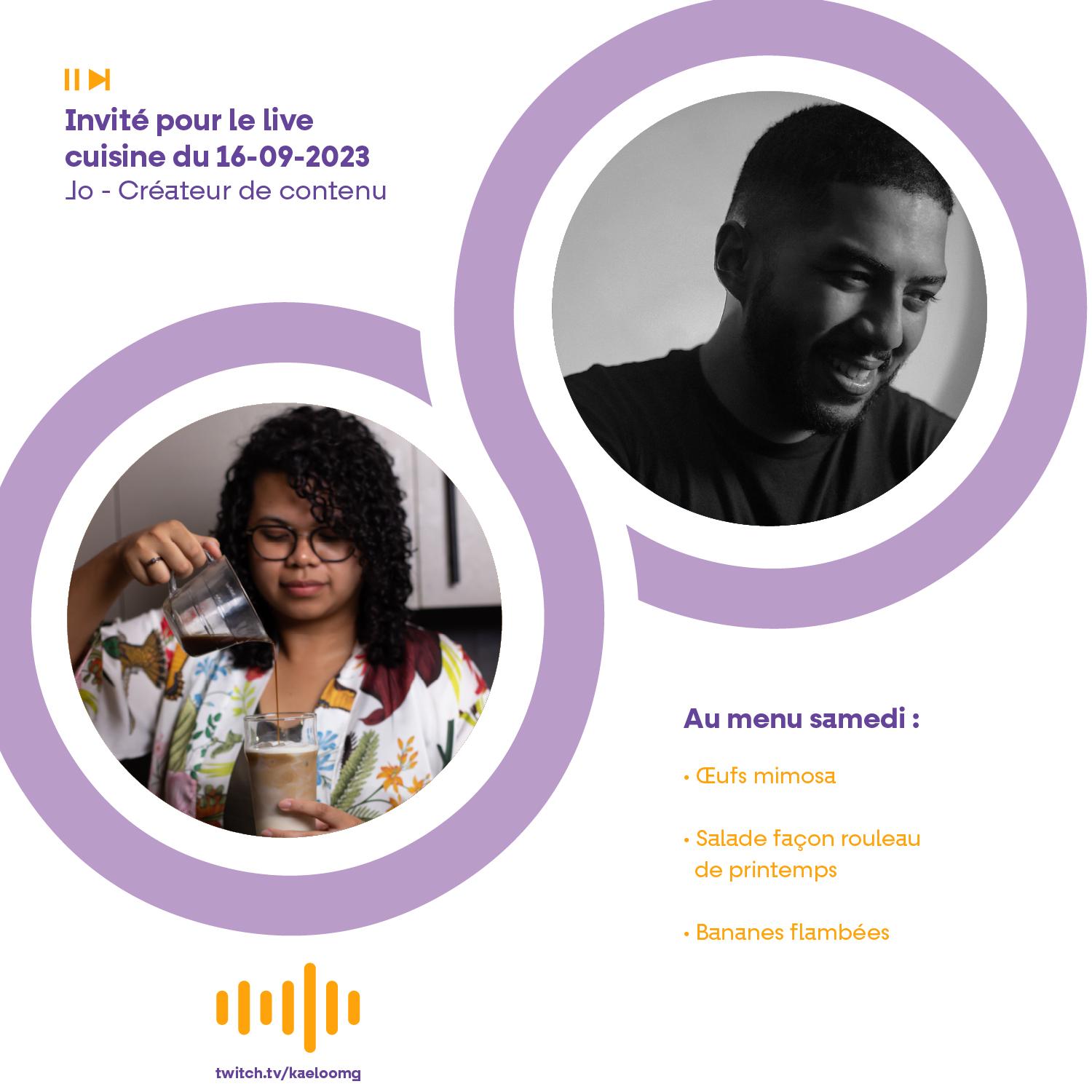 Hello guys ! Samedi on se retrouve pour une nouvelle saison des live cuisine et on reçoit Jo de Rouks & Jo, Créateur de contenu ! Quel plaisiiiiiiiiiiiir vraiment ! Au menu donc ce samedi : oeufs mimosa, petite salade façon rouleau de printemps et bananes flambées. On se dit à samedi, 10h30 sur https://twitch.tv/kaeloomg ? 😊