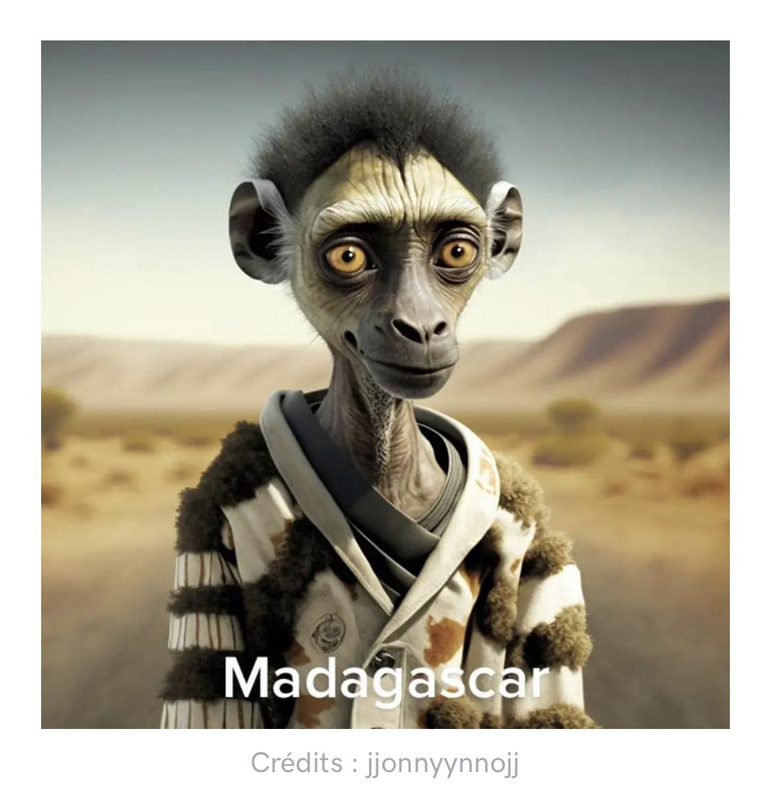 • Un malgache dessiné par une IA… moi je pense que le stéréotype sur Madagascar règne toujours… genre c’est une île déserte avec des lions et zèbres et des sauvages